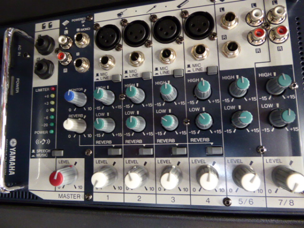 The mixer fits snugly into the back of one of the speakers.